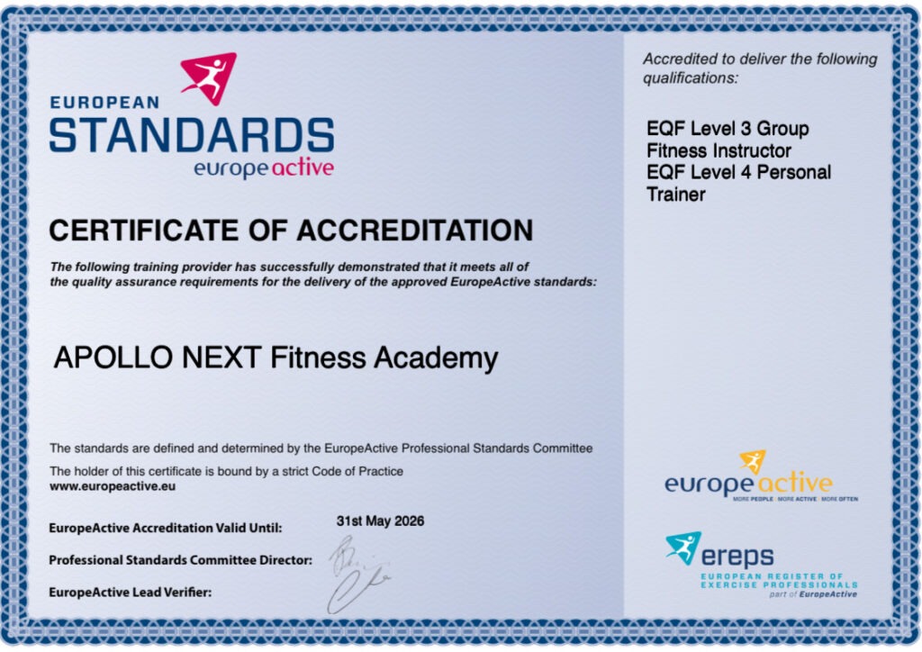 У всій Україні тільки мережа клубів APOLLO NEXT готує тренерів та фітнес інструкторів по міжнародним стандартам EREPS, що визнаються одразу в більше ніж 32 країнах.