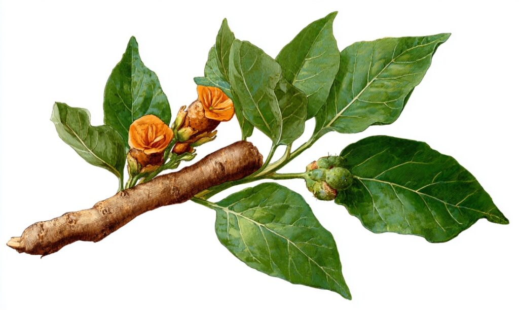 Ашваганда (Withania somnifera) — це вічнозелений кущ, який росте в Індії, на Близькому Сході та в частинах Африки. У медицині використовують коріння та листя рослини. Основні активні компоненти — вітанолідові глікозиди (withanolides), які мають адаптогенні властивості.