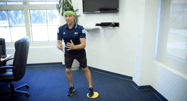 - Почни відводити ногу з рушником вбік ковзаючим рухом й одночасно виконай присідання на опорній нозі, згинаючи коліно. Не забувай, що починати треба з відведення тазу назад, спина рівна, прес напружений. Не присідай занадто низько та не відводь ногу далеко! Опускайся доти, доки не відчуваєш, що зможеш повернутися у вихідне положення.