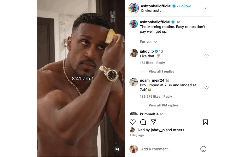 Нещодавно акаунт в соцмережі X “Tips For Men – Fashion | Essentials | Luxury” перепостив відео “Get Ready With Me”, зняте фітнес-інфлюенсером Ештоном Холлом. Зараз ранкова рутина цього чоловіка зібрала понад 696 мільйонів переглядів, викликала незліченну кількість дискусій про звички ведення щоденника й надихнула кілька вірусних відповідей. Звісно ж, багато з них були пародійними.