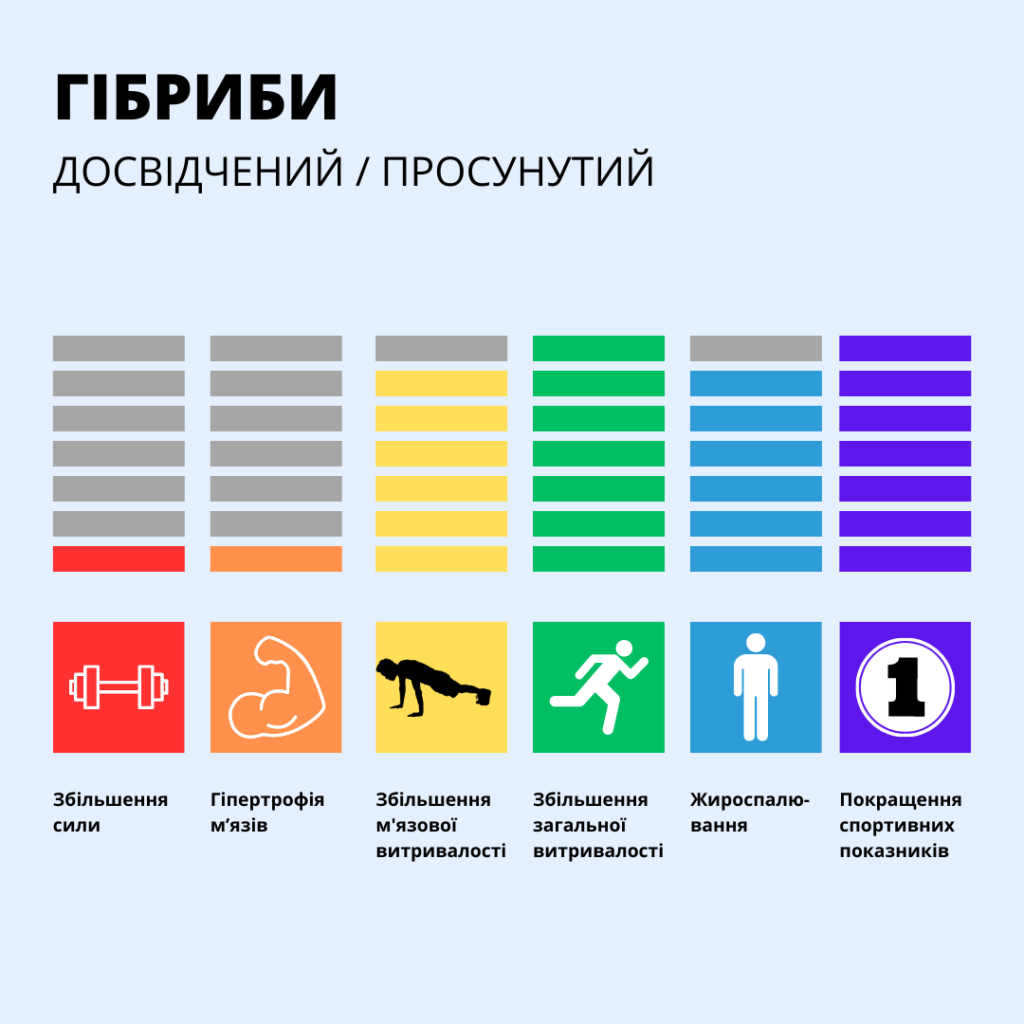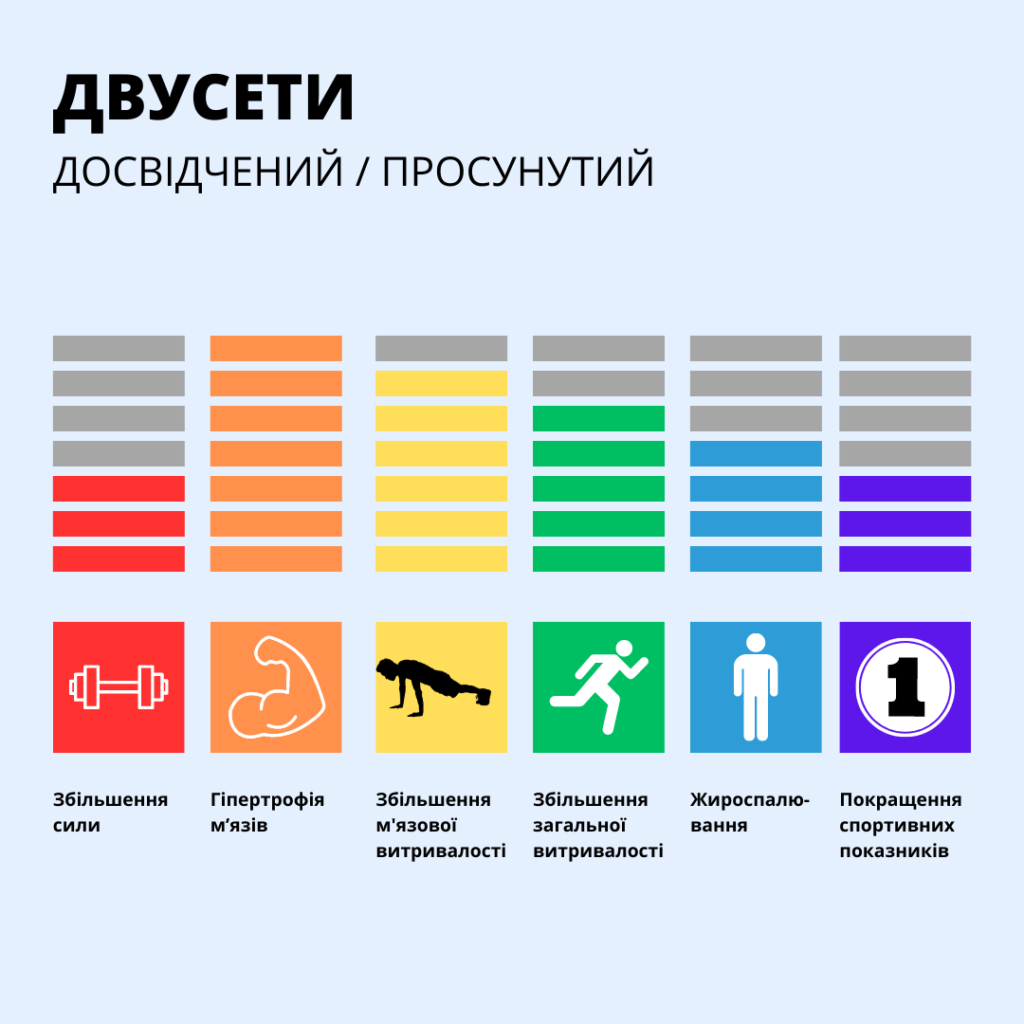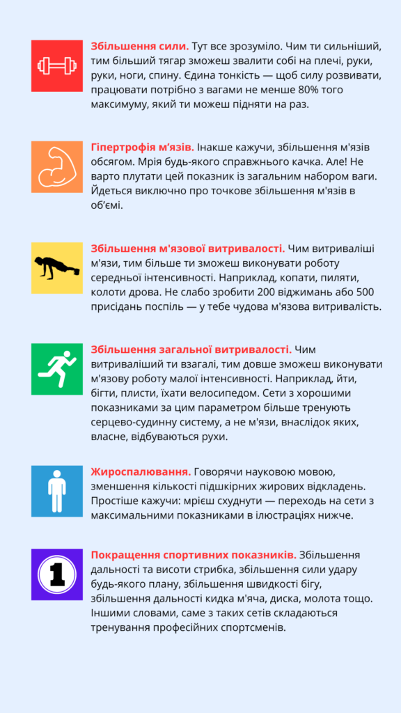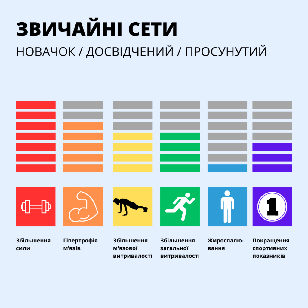 Щоб зрозуміти, які сети необхідні саме тобі, визнач для початку ступінь своєї підготовки. Потім — глянь на діаграми про кожен із типів сетів, і обери той, що ефективніше за все розвине потрібний тобі фізичний параметр.