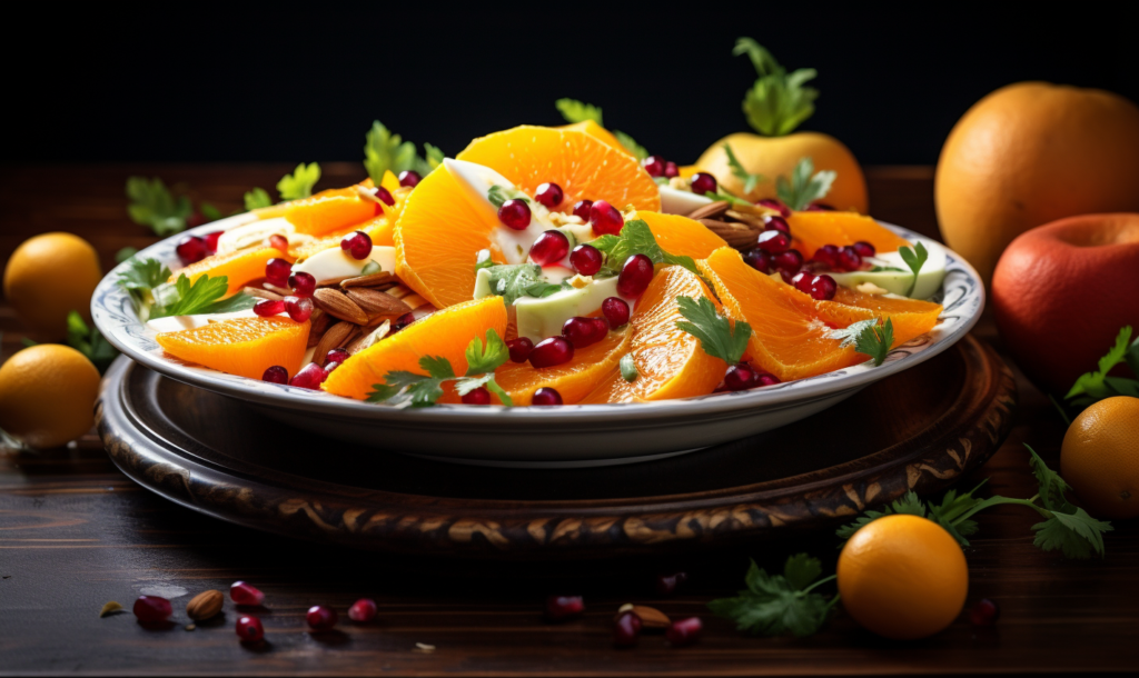 Зимовий салат з хурмою, гранатом, козячим сиром та зеленню