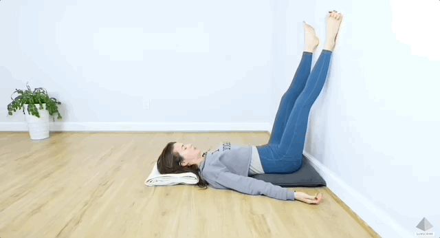 Ляж на спину, притулись сідницями до стіни, витягни ноги вгору до стелі, а задньою частиною п’ят і гомілок спирайся на стіну. Якщо в тебе є неприємні відчуття у попереку, можна підкласти під нього подушку або рушник, згорнутий валиком.