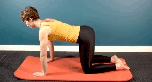 Повільно округляй і вигинай спину до стелі, опускаючи голову вниз. Під час цього руху потрібно робити видих. Потім на вдиху прогнися, опустивши живіт до підлоги, дивлячись вгору і піднімаючи куприк. Виконай 10-20 повторів. У кожній позиції затримайся хоча б на кілька секунд.