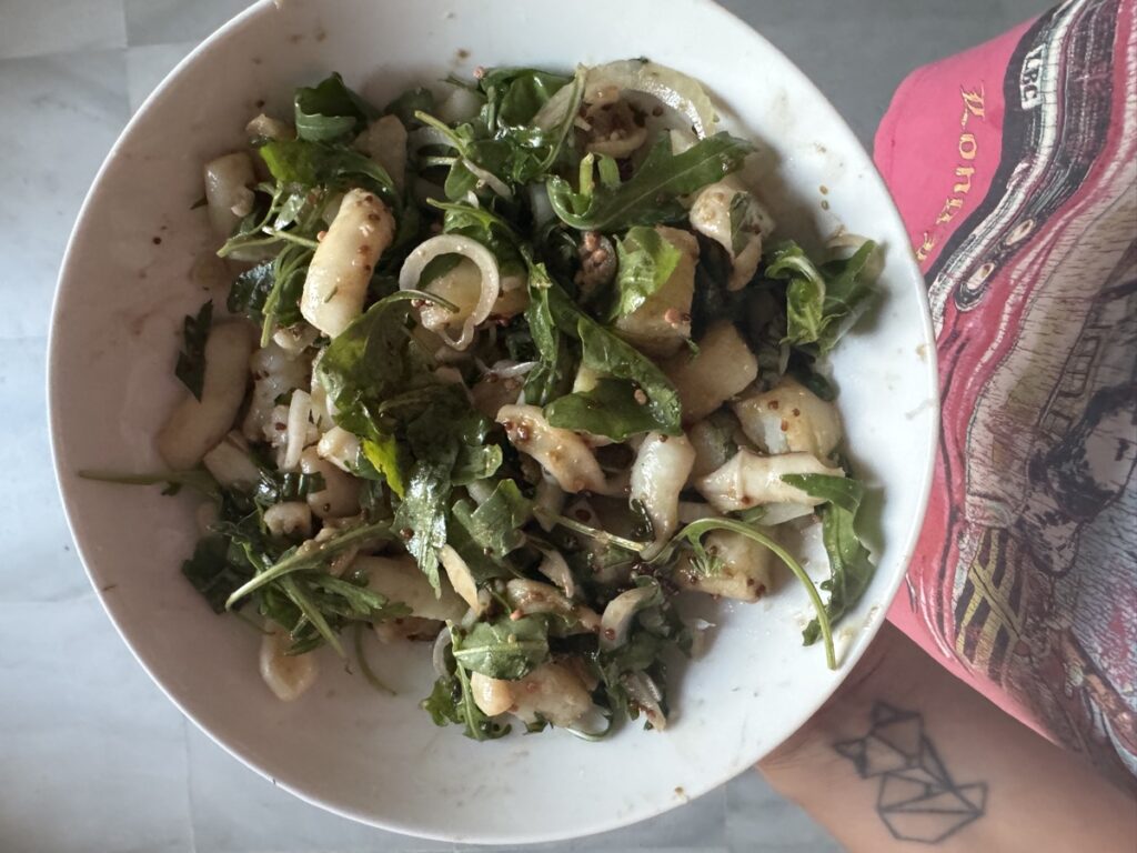 - Додай руколи, сіль, перець і кілька крапель лимонного соку.