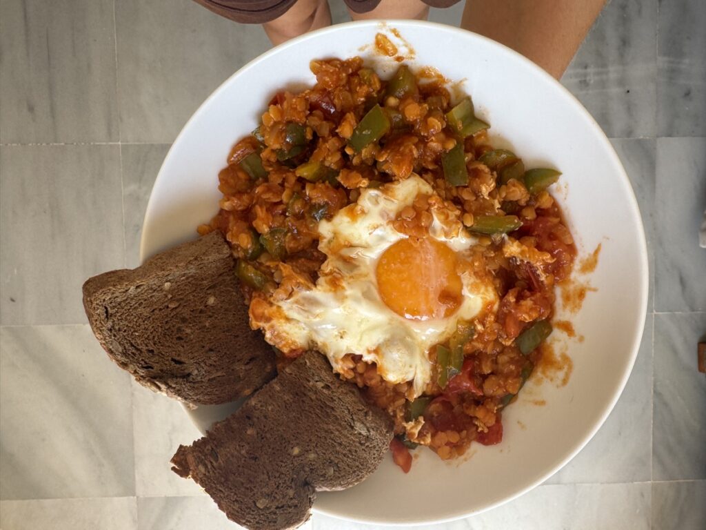 - Вмішай сочевицю, зроби заглиблення й розбий яйце.