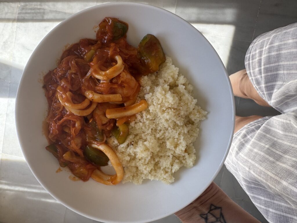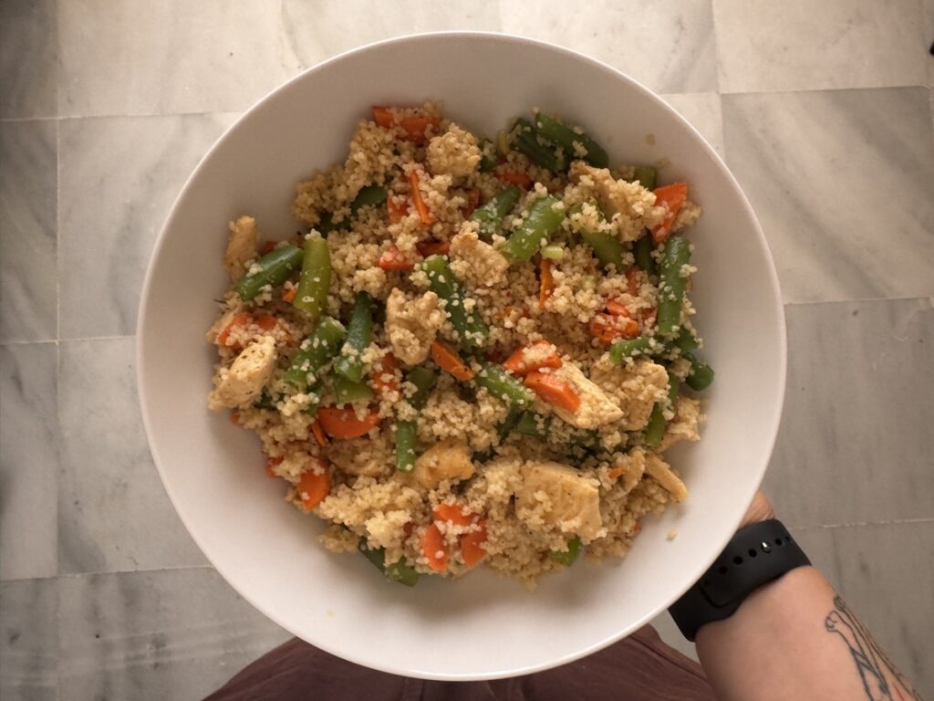 - Кус-кус залий 100 мл окропу, накрий, 5 хв; розпуши.