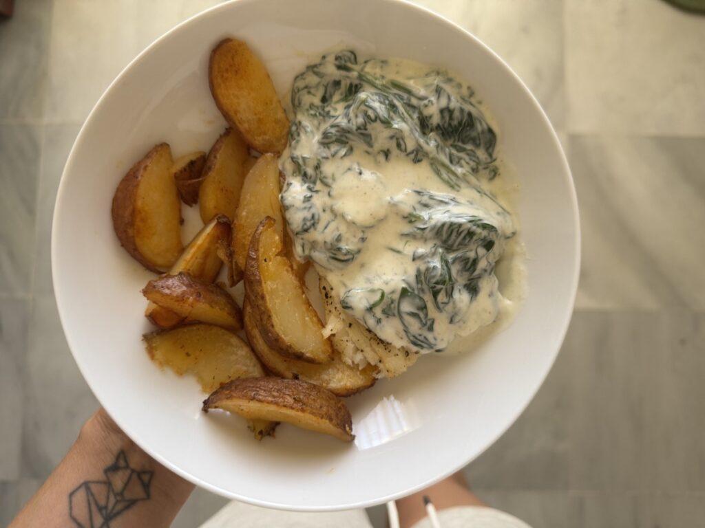 🐟 Вечеря: запечена тріска з картоплею, шпинатом і йогуртовим соусом