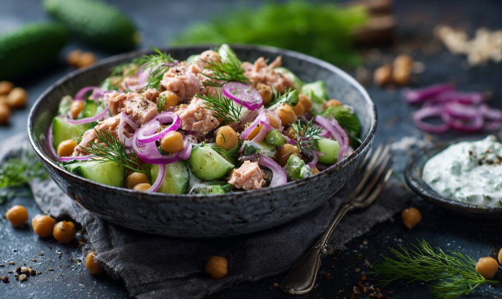 Салат із тунцем, нутом і соусом цацикі