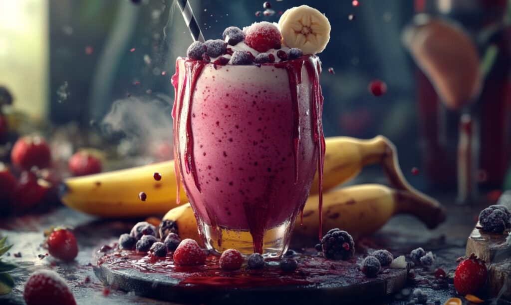 Виклади у блендер банан, ягоди, мигдальне молоко, протеїновий порошок (якщо використовуєш) та мед і збий до однорідності.
