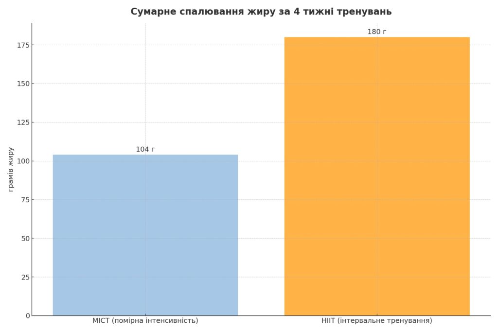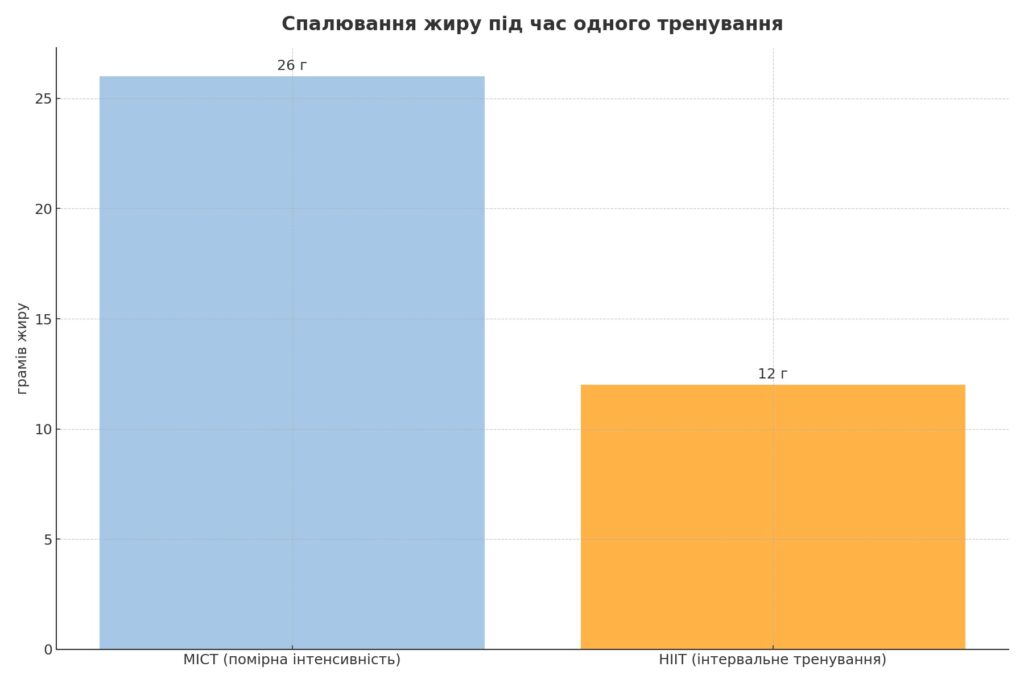 | Після тренування (EPOC) | мінімальний ефект | +15–20 % додаткових калорій (≈ 5–7 г жиру) |