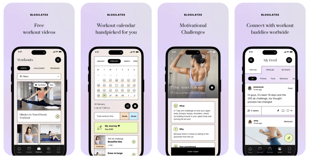 - Повна відеотека тренувань, яку можна транслювати на телевізор. Це повна відеотека тренувань Blogilates. Повнометражні відео без реклами з тренуваннями, спрямованими на: прес, руки, спину, сідниці, кардіо, ноги, розтяжку та загальне тіло.