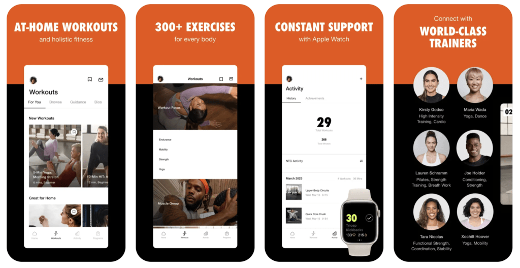 - Домашні тренування для всіх. Від тренувань для початківців до просунутих, під керівництвом тренерів, інструкторів, тренерів та експертів Nike. Кардіо, силові тренування, HIT, йога та багато іншого – вправи доступні в будь-який час і в будь-якому місці. Програми тренувань розроблені таким чином, щоб вписатися у напружене життя і допомогти досягти цілей. Тренування для кожної частини тіла – руки, ноги, прес та інше. Тренування з власною вагою, які не потребують майже ніякого обладнання. Фітнес, розроблений для всіх рівнів та тренувальні програми для всіх, в тому числі для йоги, силових вправ і тренувань з загартовування. Прем’єрні тренування з особливими спортсменами та музичними гостями.
