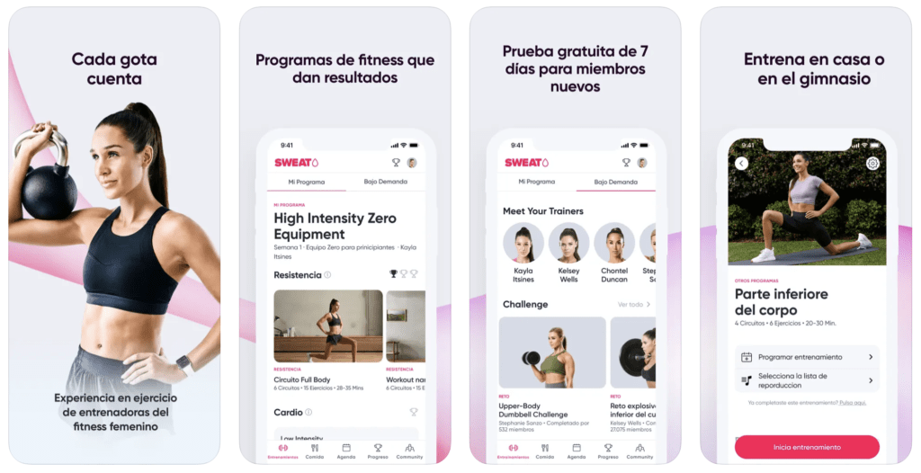 Sweat пропонує широкий набір складних, але досяжних програм з тренуваннями, які можна виконувати будь-де і будь-коли. Всі нові учасниці отримують ексклюзивний доступ до безкоштовного пробного тренування.