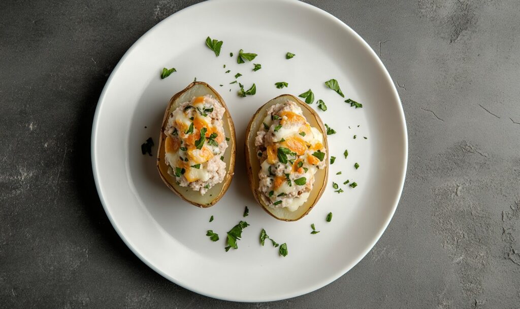 У мисці розімни м’якуш. Додай тунець, селеру, цибулю, сметану або йогурт, сіль і перець. Ложкою виклади назад у картоплю. Посип сиром. Виклади на деко. Запікай, поки сир не розплавиться (5–6 хвилин).