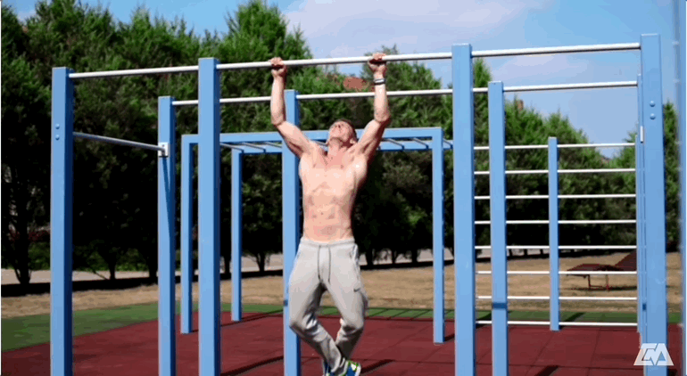 - Візьмись за перекладину руками на ширині плечей, долонями донизу, прес напружений, плечі відведені назад і вниз (не підіймай їх до вух).