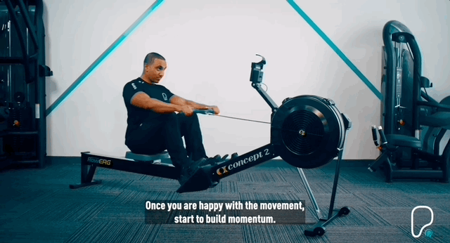 - Фаза руху (Drive). Зберігаючи нахил тулуба вперед, почни з прикладання сили до тренажера, щоб витягнути ноги. Продовжуй проштовхуватися через ноги (пʼяти) і починай піднімати верхню частину тулуба у вертикальне положення. Руки залишаються прямими. Це має бути плавний безперервний рух.