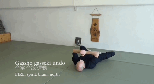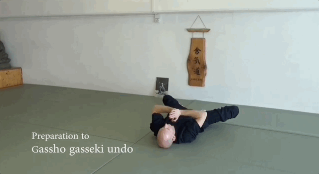 Gasshō gasseki undō або змикання рука та ніг. Ляж на спину, голова лежить на жорсткій подушці. Руки склади перед грудьми у «намасте». Спочатку натисни кінчиками пальців однієї руки на кінчики пальців іншої. Розслаб їх та повтори кілька разів. Потім, залишивши руки долоня до долоні, порухай складеними долонями вгору-вниз.