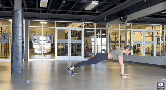 - Постав стопи на носки, потім підніми коліна і стегна вгору і назад. Ноги можуть залишатись зі злегка зігнутими колінами. Вирівняй плечі між руками і стегнами.