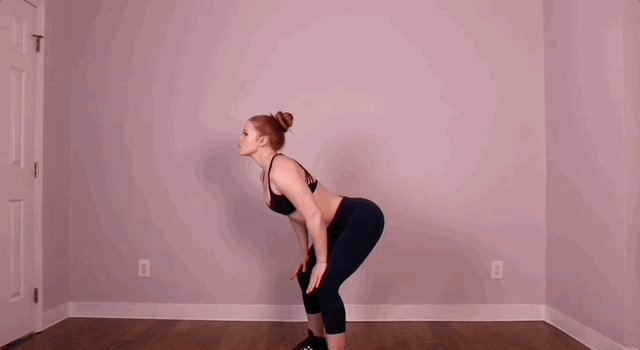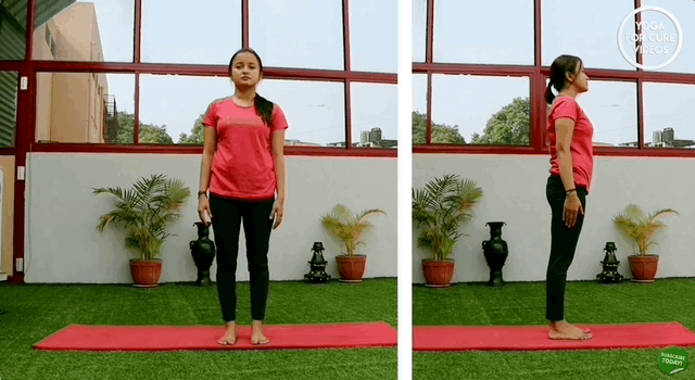 - Встань, стопи майже разом (невелика відстань). Підніми руки вгору на вдиху й на видиху нахилися до підлоги. Згинатися потрібно не через поперек, а через кульшові суглоби. Старайся тримати ноги прямими й щоб руки торкалися підлоги. Якщо не виходить, то поклади їх на блок або просто залиш звисати розслабленими.