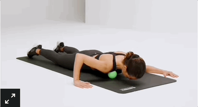 Також, якщо грудні мʼязи сильно напружені, ти можеш лягти на живіт на килимок, покласти мʼячик під плече, трохи відступивши від місця кріплення мʼязів на плечі, й, надавивши на мʼячик власною вагою, повільно та обережно прокочувати його вздовж мʼяза під ключицею. Не забувай підтримувати себе руками.