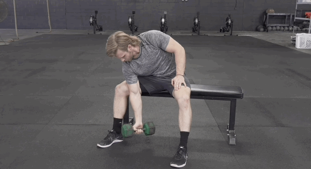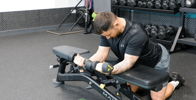 - Згинай руку з гантеллю, контролюючи рух вгору та вниз. Не допомагай корпусом.