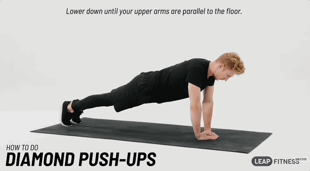 - Прийми упор лежачи, але зведи долоні разом під грудьми так, щоб великі та вказівні пальці утворили трикутник (діамант). Також ти можеш стати у планку, поставити руки в потрібне положення і почати віджиматися.