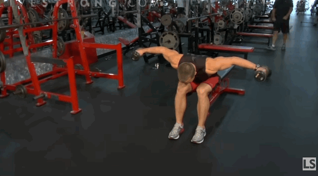 - Нахились уперед з гантеллю, зафіксуй плече паралельно підлозі.