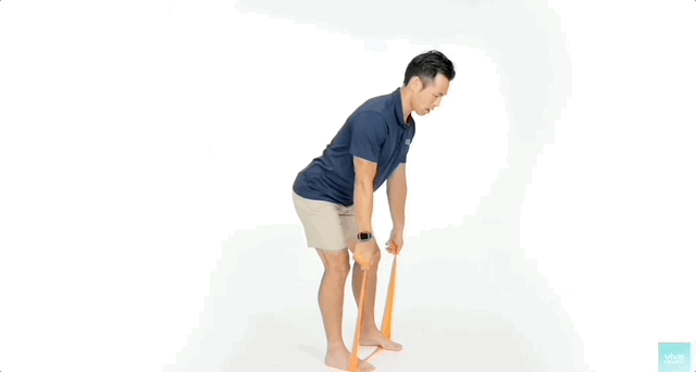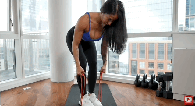 - Підтягни фітнес-стрічку до себе, стискаючи лопатки. Навантаження повинно бути на мʼязи спини, а не рук.