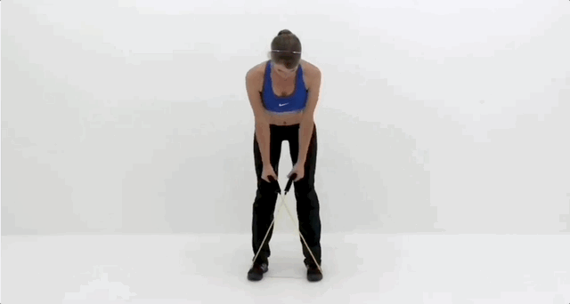 - Стань у центрі гумки, поставивши ноги на ширині плечей, візьмися за неї обома руками.