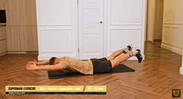 - Напруж прес, а потім одночасно відірви руки та ноги від землі, тримаючи шию в нейтральному положенні.