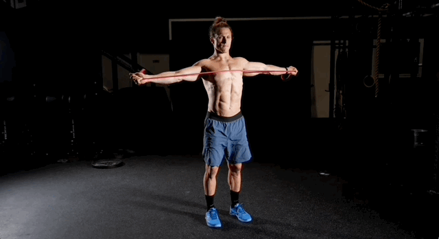 - Напруж прес і тягни стрічку в сторони, тримаючи руки витягнутими й використовуючи м’язи верхньої та середньої частини спини для керування рухом.