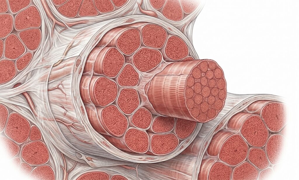М’язове волокно — це надзвичайно велика клітина. Настільки велика, що одного ядра їй не вистачає: у кожному волокні є десятки ядер (міоядер). Чим більший і сильніший м’яз — тим більше міоядер.