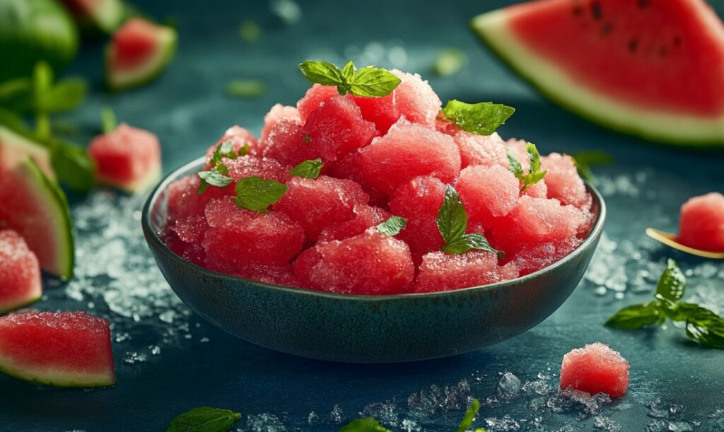- 6 чашок нарізаного кавуна без кісточок (з ½ невеликого кавуна), плюс невеликі частинки для прикраси;