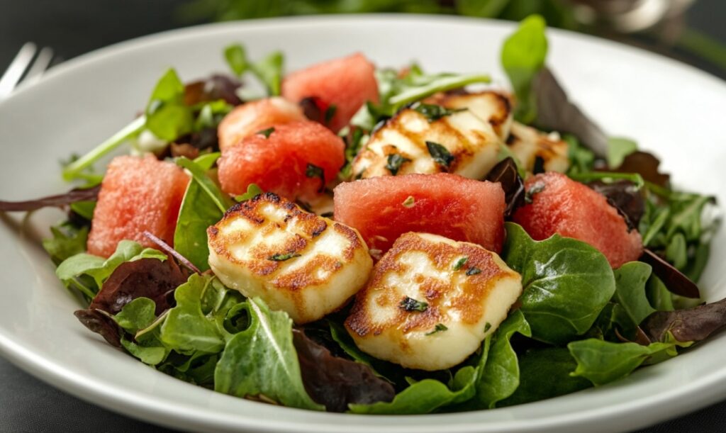 Кавун, квасолю та м’яту полий лимонним соком та оливковою олією, добре приправ, а потім виклади на тарілки разом зі скибочками халумі.