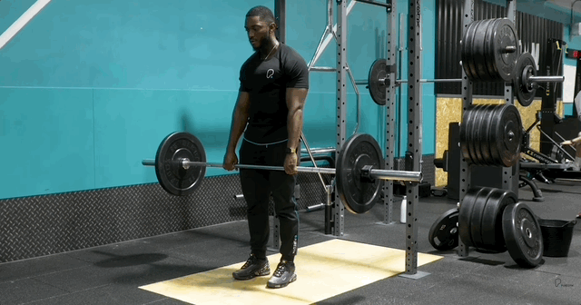 - Стань прямо, тримаючи гриф перед стегнами хватом зверху на ширині плечей або трохи ширше.