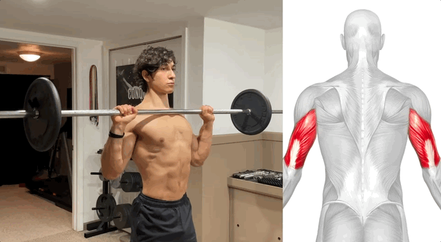 Важливо: робоча вага тут значно менша, ніж у жимах. Якщо для підйому грифа доводиться розгойдуватись або відхилятись назад — вага завелика. Ця вправа повністю про контроль і відчуття м’яза, а не про кілограми на грифі.