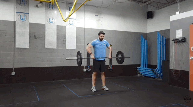 - Гриф висить перед стегнами. Тягни його вгору вздовж тіла: лікті ведуть рух і мають бути вищими ніж кисті протягом усього підйому.