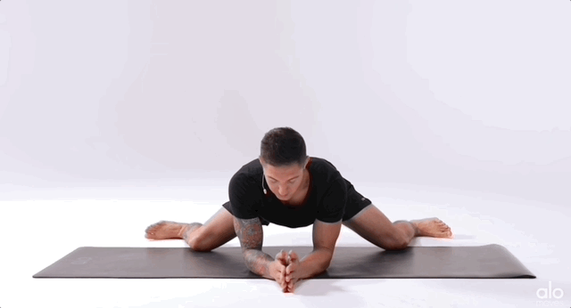 - Оставайся в этом положении или обхвати руками стопы и осторожно наклонись к ногам, пытаясь раскрыть бедра как можно шире.