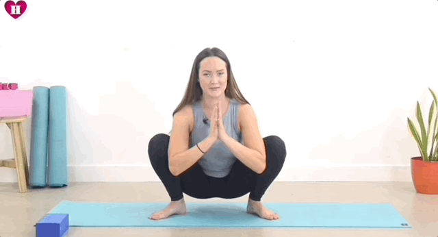 - Соедини руки на груди в жесте «намасте» и присядь, поместив локти во внутреннюю часть колен.