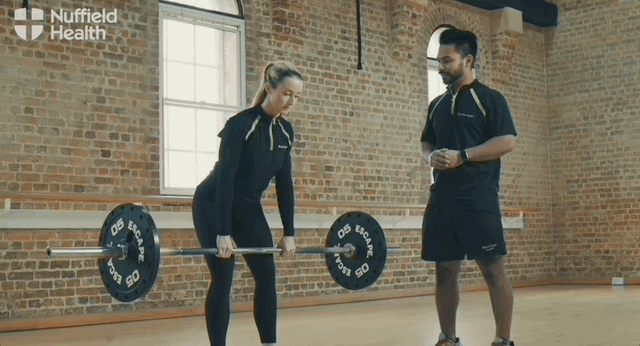 - Сделай глубокий вдох, напряги пресс и наклоняйся вперед, отводя таз назад, пока штанга не окажется где-то на уровне середины голени. Глубина наклона может варьироваться в зависимости от твоей гибкости. Чем ниже ты будешь наклоняться, тем сильнее можно согнуть колени.
