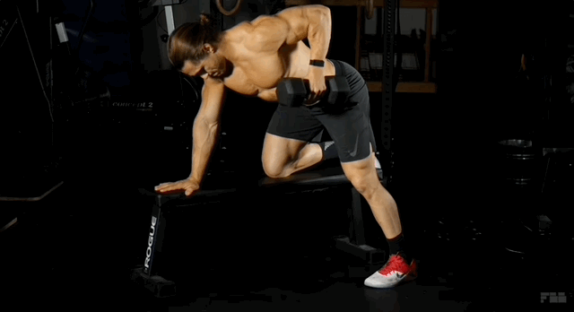 - Свободной рукой возьми гантель с пола и подтягивай ее к себе, пока плечо не будет параллельно полу. Локоть может подняться немного выше. Гантель тянется к низу живота. Корпус старайся не разворачивать в сторону. В верхней части задержись на секунду.