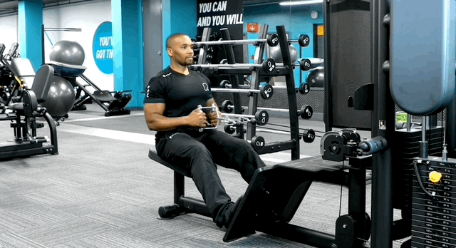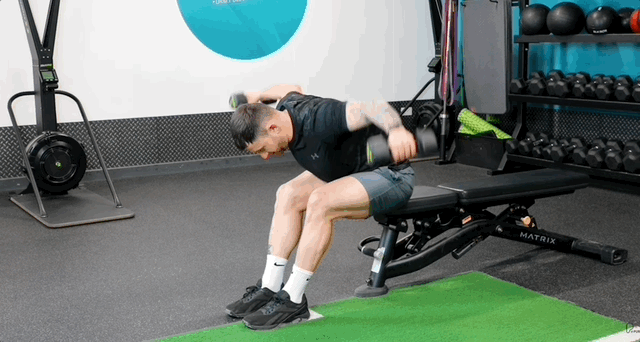 - Медленно опусти гантель назад по той же траектории.