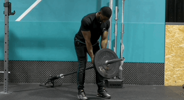 - Установи необходимый вес и стань так, чтобы T-гриф оказался между ног.