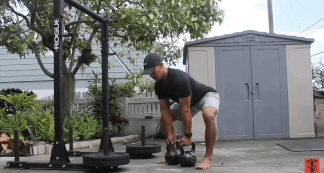 - Возьмись за ручки гири нейтральным хватом (ладони направлены друг к другу) и подтяни одну гирю. Локоть тянется к бедру (держи его близко к бокам), сжимая лопатку вверху. Во время этого движения нажми (обопрись) на противоположную гирю, лежащую на полу.