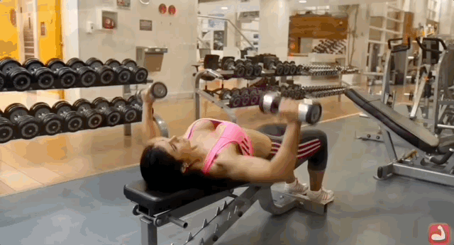 - Чтобы занять правильную позицию, ляг на спину и держи гантели близко к груди. В нижнем положении гантели должны находиться немного сбоку от груди, а плечо и предплечье образуют угол 90 градусов. Убедись, что ты полностью контролируешь гантели. Это будет начальная позиция.