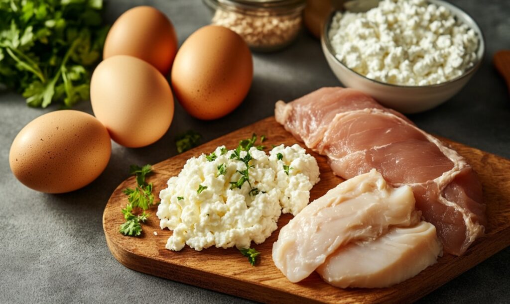 Примерами продуктов, богатых белками, являются мясо, яйца, домашняя птица, рыба, тофу и чечевица.